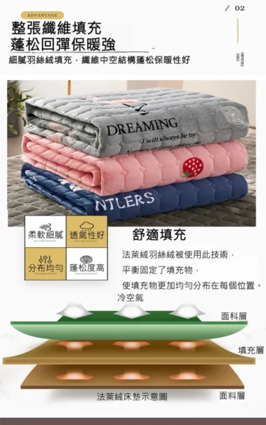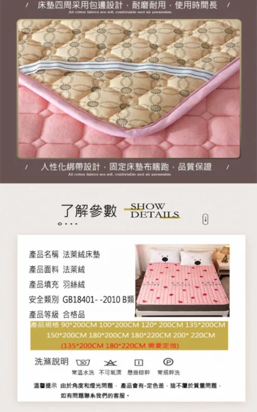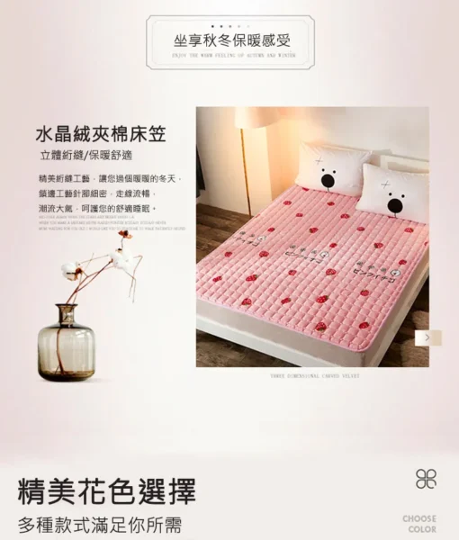 • 水晶絨夾棉床笠、立體絎縫、保暖舒適