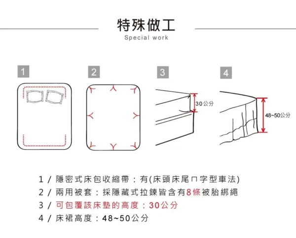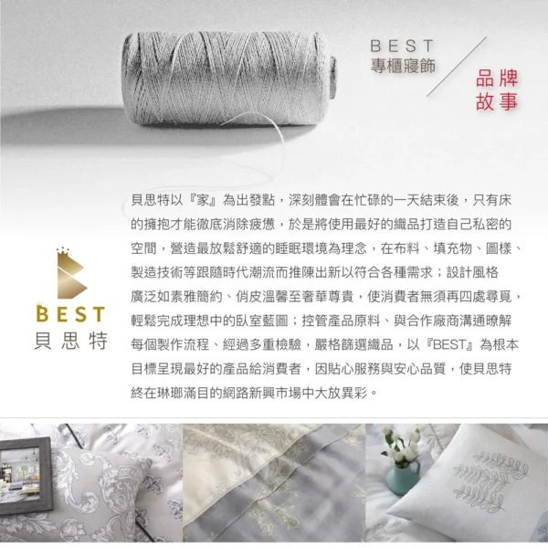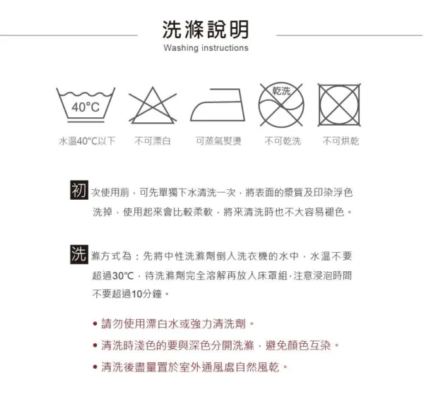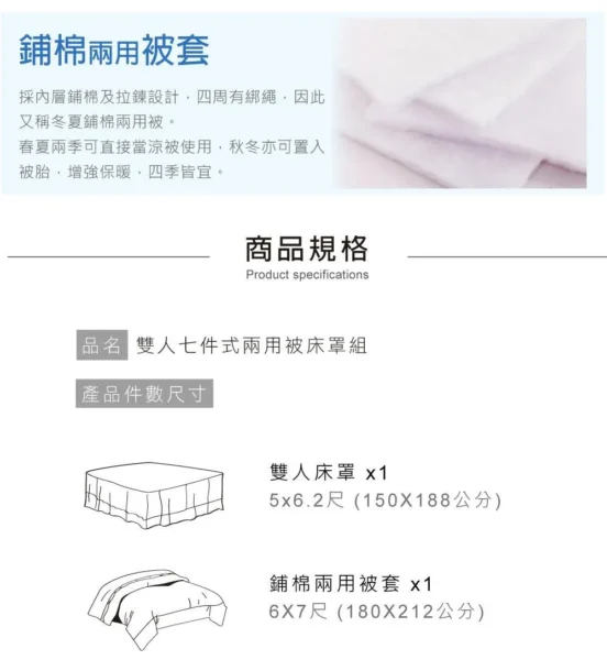 商品:【BEST貝思特】特大100%天絲八件式床罩組 ▼商品規格 鋪棉床罩 x 1 / 6 x 7尺 (182 x 212 公分) 鋪棉兩用被套 x 1 / 6 x 7尺 (182 x 212 公分) 歐式鋪棉枕套 x 2 (45 x 75 公分) +/- 1~2公分為合理範圍 美式薄枕套 x 2 (45 x 75 公分) +/- 1~2公分為合理範圍 抱枕套 x 1 抱枕枕心 x 1 附精緻收納提袋 ▼商品材質 棉被: 表布(上/下表布):100%萊賽爾纖維 (頂級天絲) 填充物:100%聚酯纖維 床罩: 表布:100%萊賽爾纖維 (頂級天絲) 填充物:100%聚酯纖維 鋪棉枕套: 表布(上/下表布):100%萊賽爾纖維 (頂級天絲) 填充物:100%聚酯纖維 薄枕套:100%萊賽爾纖維 (頂級天絲) 抱枕套:100%萊賽爾纖維 (頂級天絲) 抱枕枕心:100%聚酯纖維 ▼商品內容 被套內綁繩:四角,可以綁棉被胎固定使用,使被胎不易滑動 隱密式床包收縮鬆緊帶:有【床頭床尾ㄇ字型車工、採用直徑1.5cm高彈力鬆緊帶】 可承受之床墊厚度:30 公分【市售獨立筒床墊皆可適用】 產地:中國 (台資企業) ▼清潔方式 可水洗 (水溫請勿超過30度C) / 可乾洗 / 不可漂白 / 不可烘乾 使用大型洗衣袋清洗,可保持色澤鮮明,更不易造成勾紗等現象 深色商品初次下水清洗會有量染料溶解於水中屬正常情形,請勿與淺色衣物一同清洗 ▼注意事項 購買前請先確認賣場說明,有任何疑問貨需求歡迎先提問,之後請核對物品、尺寸、配件等 商品不包含特殊造型(如蕾絲邊、荷葉邊等),實際以出貨為主 網頁產品因每台電腦設定不同關係,顏色可能與實品略有差異,實品顏色更佳 寢具商品屬為個人衛生用品,經使用或下水後,恕不接受退換貨