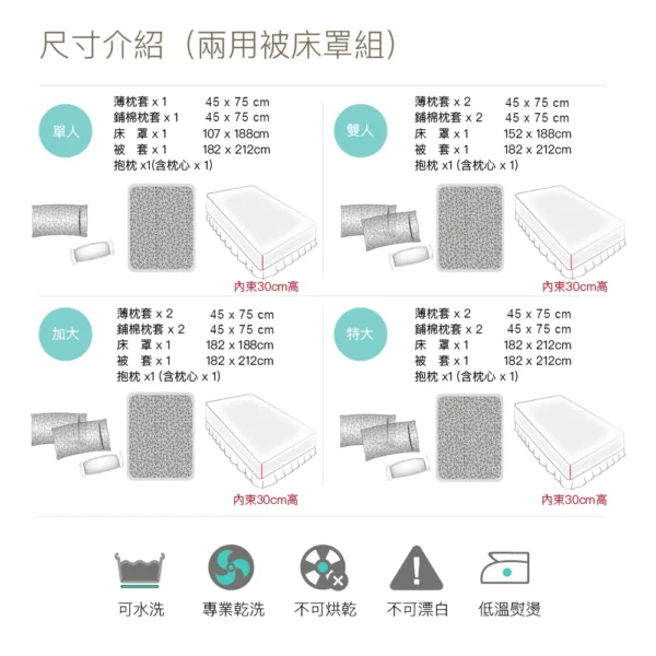 商品:【BEST貝思特】特大100%天絲八件式床罩組 ▼商品規格 鋪棉床罩 x 1 / 6 x 7尺 (182 x 212 公分) 鋪棉兩用被套 x 1 / 6 x 7尺 (182 x 212 公分) 歐式鋪棉枕套 x 2 (45 x 75 公分) +/- 1~2公分為合理範圍 美式薄枕套 x 2 (45 x 75 公分) +/- 1~2公分為合理範圍 抱枕套 x 1 抱枕枕心 x 1 附精緻收納提袋 ▼商品材質 棉被: 表布(上/下表布):100%萊賽爾纖維 (頂級天絲) 填充物:100%聚酯纖維 床罩: 表布:100%萊賽爾纖維 (頂級天絲) 填充物:100%聚酯纖維 鋪棉枕套: 表布(上/下表布):100%萊賽爾纖維 (頂級天絲) 填充物:100%聚酯纖維 薄枕套:100%萊賽爾纖維 (頂級天絲) 抱枕套:100%萊賽爾纖維 (頂級天絲) 抱枕枕心:100%聚酯纖維 ▼商品內容 被套內綁繩:四角,可以綁棉被胎固定使用,使被胎不易滑動 隱密式床包收縮鬆緊帶:有【床頭床尾ㄇ字型車工、採用直徑1.5cm高彈力鬆緊帶】 可承受之床墊厚度:30 公分【市售獨立筒床墊皆可適用】 產地:中國 (台資企業) ▼清潔方式 可水洗 (水溫請勿超過30度C) / 可乾洗 / 不可漂白 / 不可烘乾 使用大型洗衣袋清洗,可保持色澤鮮明,更不易造成勾紗等現象 深色商品初次下水清洗會有量染料溶解於水中屬正常情形,請勿與淺色衣物一同清洗 ▼注意事項 購買前請先確認賣場說明,有任何疑問貨需求歡迎先提問,之後請核對物品、尺寸、配件等 商品不包含特殊造型(如蕾絲邊、荷葉邊等),實際以出貨為主 網頁產品因每台電腦設定不同關係,顏色可能與實品略有差異,實品顏色更佳