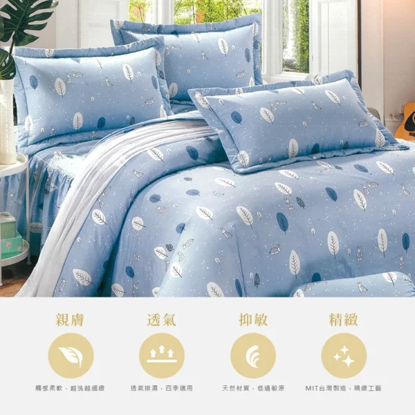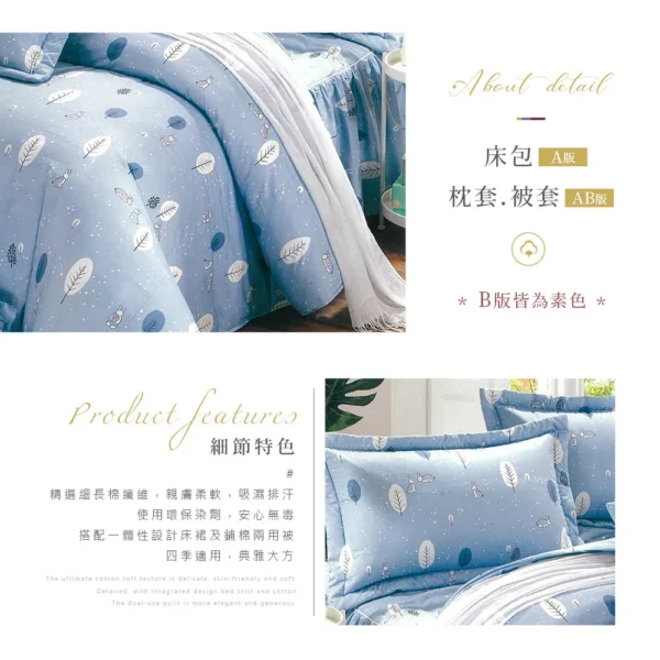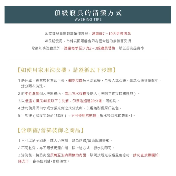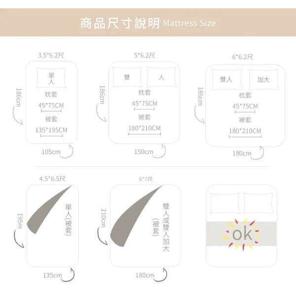 ◇尺寸說明 雙人加大鋪棉床罩6×6.2尺(180x186cm) x1 / 可包覆床墊高度:約35cm±3% 雙人鋪棉兩用被套6×7尺(180*210cm) x1 / 無被頭設計 歐式壓框枕套(45*75cm) x2 方形抱枕套x1 / 方形抱枕芯x1 ◇商品說明 ▪ 表布: 100%純棉 ▪ 內容物:100%聚酯纖維 ▪ 底布:35%棉65%聚酯纖維 ▪ 產地:台灣 ▪ 床罩:採用全包覆式鬆緊帶,可防止床罩滑動 ▪ 枕套:歐式壓框枕套 ▪ 被套:有四角綁繩 ◇注意事項 ▪ 洗滌方式:40度以下低溫洗滌/可專業乾洗/不可烘乾/不可漂白/可熨燙(勿超過150度) ▪ 保養方式:請以40度冷水搭配中性洗劑(中性柔軟劑),如使用機洗,請翻到反面裝入洗衣袋再清洗,脫水後自然晾乾即可。 ▪ 個人衛生用品,如經拆封使用、下水洗滌、沾染各種氣味或拆解以致缺乏完整性及失去再販售價值時,恕不接受退換貨。 ▪ 本商品不含拍攝道具,請以「產品內容」為主。 ▪ 網頁圖片因拍攝關係,與實品略有差異,實際顏色以出貨商品為準。