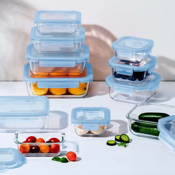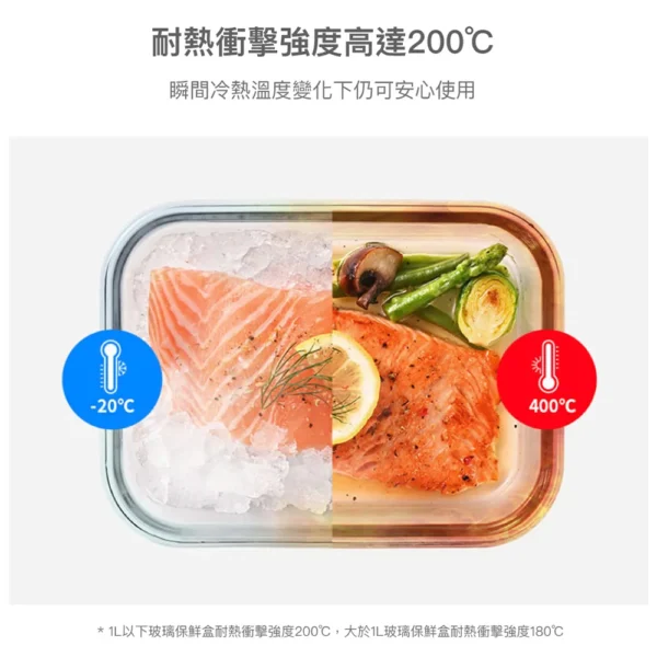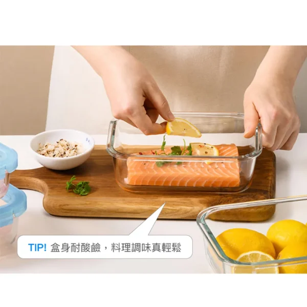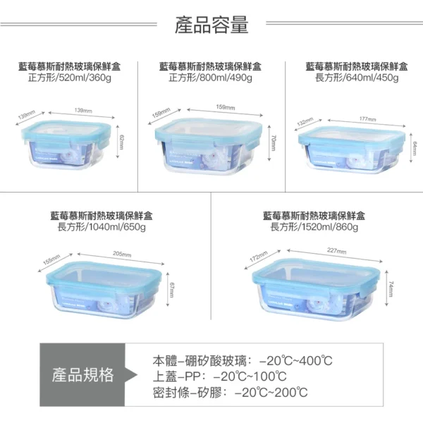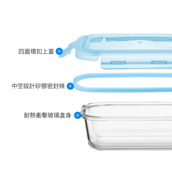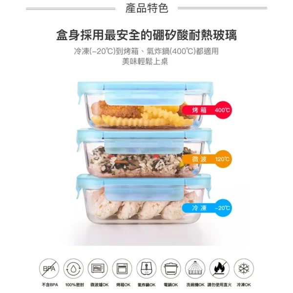 ■規格:1040ml ■尺寸:205*155*67mm ■材質 本體-硼矽酸玻璃:-20℃~400℃ 上蓋-PP:-20℃~100℃ 密封條-矽膠:-20℃~200℃ ■重量:650g ■產地:中國 【注意事項】 1.請勿用火直接加熱。 2.使用於烤箱、電鍋(需加蒸架)時,請勿連盒蓋共同放入加熱。 3.連同上蓋微波時請勿密封,並勿長時間加熱。上蓋遇熱變形係屬正常現象,請安心使用。 4.四面環扣100%密封,加熱玻璃保鮮盒後,取拿時請放置於托盤上以利安全。 5.冷凍保管時,含豐富水份之固體食物或液體請勿裝滿容器。 6.請勿於未盛裝食物時加熱。請勿用粗硬材質之清潔刷清洗,以避免玻璃表面產生刮痕以致破裂。 7.玻璃容器屬於易碎產品,請避免施力碰擊,使用前請確認是否有裂紋或缺口,如有缺陷請勿使用。