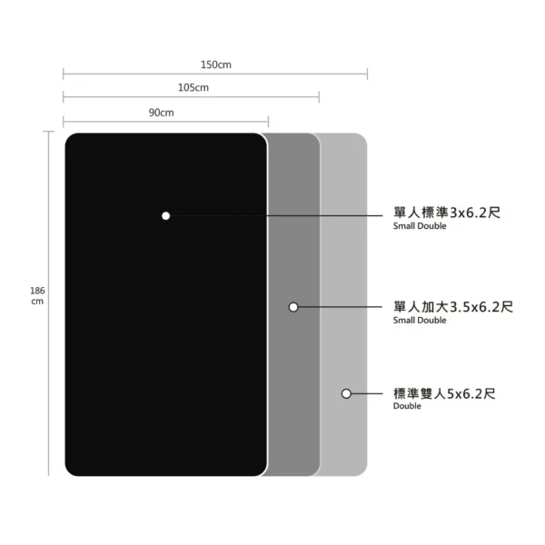 【尺寸】 總寬 150 × 總深 186 × 總高 12 cm ※尺寸為人工丈量略有±3cm誤差值,請以實品為主。 【材質】 黑色立體加厚舒柔布、高密度泡棉、高碳鋼獨立筒8cm ※詳情及其他尺寸請參考圖片說明。